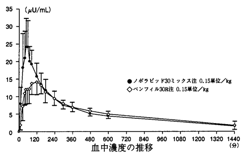 2型糖尿病患者を対象とした比較試験(ノボラピッド30ミックス注群:321例、ペンフィル30R注群:107例)の成績概要は以下のとおりである。ノボラピッド30ミックス注は1日2回朝食及び夕食直前投与、ペンフィル30R注は1日2回朝食及び夕食30分前投与とした。プライマリーエンドポイントの投与後24週のHbA1cを両群で比較した結果、本剤のペンフィル30R注に対する非劣性が示された。また、本剤投与群の朝食後90分血糖値は、投与後24週においてペンフィル30R注群に比較し有意に低かった。投与後48週の投与量は本剤投与群で多かったが、低血糖症状の発現が増加することはなかった。両群のインスリン アスパルト-ヒトインスリン交叉抗体価は投与後24週までやや上昇し(増加量は本剤投与群で4.3%、ペンフィル30R注群で1.5%)、増加量は本剤投与群で多かった。投与後24週以降、抗体価は低下した3) 。HbA1c、朝食後90分血糖値及び投与量