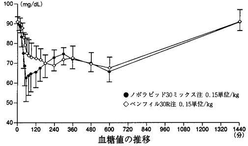 健康成人男子16例にノボラピッド30ミックス注又はペンフィル30R注(中間型混合ヒトインスリン(速効型:中間型=3:7))0.15単位/kgを皮下注射したときのΔ血糖値(投与前値からの血糖降下量)の薬力学的パラメータを示す。本剤の投与により、速やかな血糖降下作用が認められ、最大血糖降下量(Δ血糖値のCmax)はペンフィル30R注に比較して大きいことが示された2) 。Δ血糖値の薬力学的パラメータ