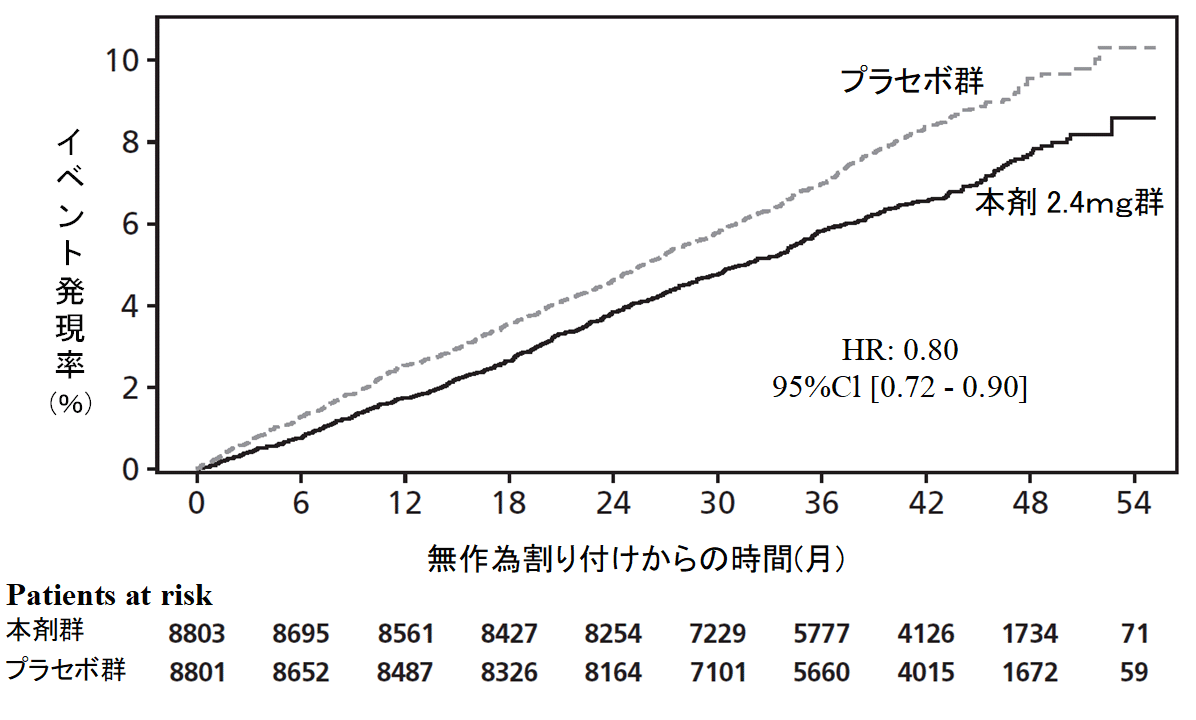 試験期間(in-trial観察期間)の中央値は41.8ヵ月であった。主要評価項目である無作為割り付けから主要な心血管系事象(心血管死、非致死性心筋梗塞又は非致死性脳卒中のいずれか)の最初の発現までの時間について、プラセボに対する本剤2.4mgの優越性が示された(p<0.0001、片側有意水準0.02281、下表及び下図参照)。