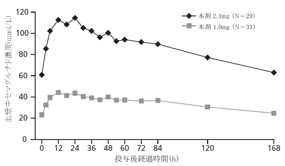 肥満者を対象に本剤を週1回、21週間反復皮下投与後の薬物動態プロファイルを検討した。本剤は、週1回0.25mgで投与を開始し、4週間間隔で0.5mg、1.0mg、1.7mg及び2.4mgへ増量した。定常状態における本剤1.0mg及び2.4mg投与時の薬物動態パラメータ及び血漿中濃度推移を以下に示す7)(外国人データ)。
