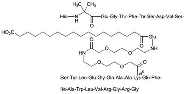セマグルチドは、遺伝子組換えヒトグルカゴン様ペプチド-1(GLP-1)類縁体であり、ヒトGLP-1の7~37番目のアミノ酸に相当し、2番目のAla及び28番目のLysは、それぞれ2-アミノ-2-メチルプロパン酸及びArgに置換され、1,18-オクタデカン二酸が1個のGlu及び2個の8-アミノ-3,6-ジオキサオクタン酸で構成されるリンカーを介して20番目のLysに結合している。セマグルチドは、31個のアミノ酸残基からなる修飾ペプチドである。