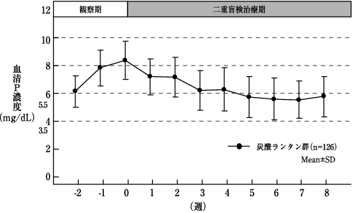 高リン血症を呈する血液透析患者259例(本剤注3)126例、沈降炭酸カルシウム133例)を対象とした比較試験において、本剤注3)を1日750mgから投与を開始し、1日2250mgまで適宜増減した。その結果、血清リン濃度(Mean±SD)は、投与開始時8.35±1.38mg/dLから投与終了時5.78±1.44mg/dLと低下が認められた。また、血清カルシウム濃度(Mean±SD)は、投与開始時9.02±0.69mg/dL、投与終了時9.22±0.61mg/dLと変化は認められず、本剤注3)の臨床的有用性が確認された。