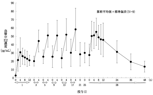 更年期障害及び卵巣欠落症状を有する患者にエストラジオール(E2)0.5mg及び1.0mgを1日1回、8週間反復経口投与したとき、平均血清中E2濃度は0.5mg投与群(72例)で投与前値(3.10pg/mL)から投与8週後(又は中止時)で21.41pg/mL、1.0mg投与群(71例)で投与前値(2.25pg/mL)から44.95pg/mLに上昇した21)。