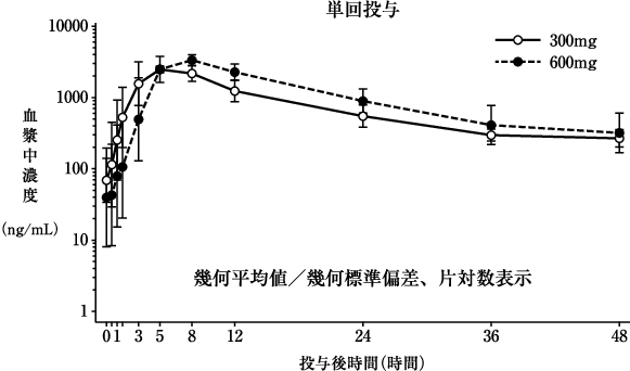 健康成人6例に本剤300mg注1)を空腹時に単回経口投与したときの絶対的バイオアベイラビリティは30%であった(外国人データ)。