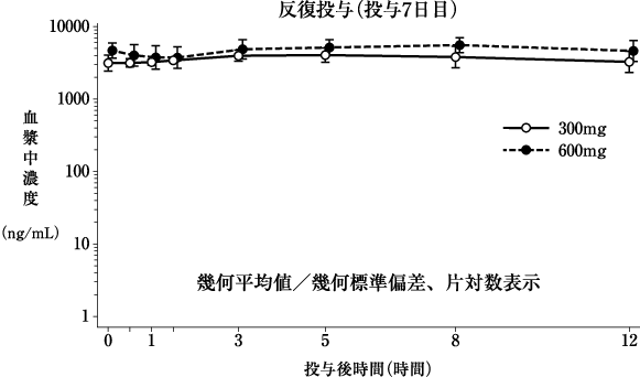 日本人の遠隔転移を有する去勢抵抗性前立腺癌患者に本剤300注1)又は600mgを食後に単回及び1日2回反復経口投与したときのダロルタミドのPKパラメータ及び血漿中濃度推移は以下のとおりであった。また、本剤600mgを食後に1日2回反復経口投与した際の投与7日目におけるダロルタミドの蓄積率は2.34であった。