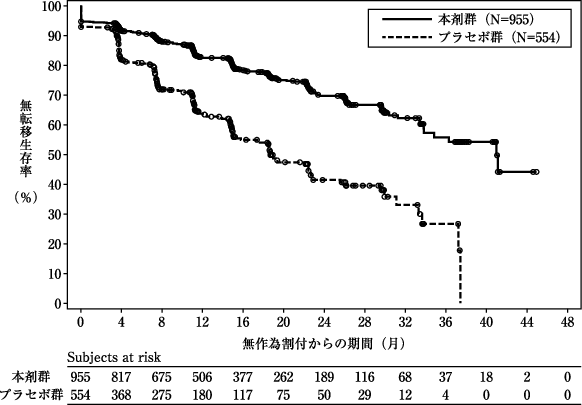 化学療法歴のない前立腺特異抗原(PSA)倍加時間が10ヵ月以下注2)の遠隔転移を有しない去勢抵抗性前立腺癌患者注3)を対象に、アンドロゲン除去療法(ADT)注4)併用下で本剤(本剤群)とプラセボ(プラセボ群)を比較することを目的とした無作為化二重盲検試験が実施された(有効性解析対象例:1509例注5)、日本人95例を含む)。本剤群では、本剤600mgを1日2回食後に連日経口投与した。主要評価項目である無転移生存期間(MFS)の中央値は、本剤群で40.37ヵ月、プラセボ群で18.43ヵ月であり、本剤群のMFSはプラセボ群と比較して有意に延長した(ハザード比0.413、95%信頼区間:0.341~0.500、p値<0.000001、層別ログランク検定)。