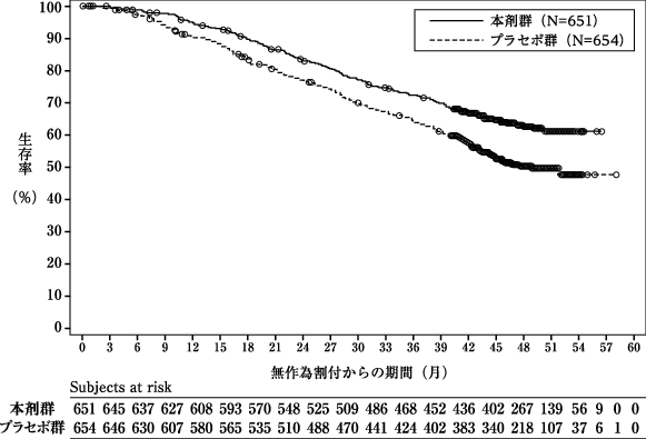 遠隔転移を有する前立腺癌患者を対象に、ADT注6)及びドセタキセル注7)併用下で本剤(本剤群)とプラセボ(プラセボ群)を比較することを目的とした無作為化二重盲検試験が実施された(有効性解析対象例:1305例、日本人148例を含む)。本剤群では、本剤600mgを1日2回食後に連日経口投与した。主要評価項目である全生存期間(OS)の中央値は、本剤群で未達、プラセボ群で48.9ヵ月であり、本剤群のOSはプラセボ群と比較して有意に延長した(ハザード比0.675、95%信頼区間:0.568~0.801、p値<0.0001、層別ログランク検定)。