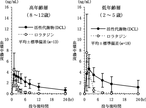健康成人男性(5例)にロラタジン錠10mgを1日1回5日間、空腹時に反復経口投与したとき、血漿中ロラタジン濃度は連投開始後4日までに定常状態に到達し、AUC(0-24hr)について算出した累積係数は1.3であった。健康成人男性(6例)にロラタジン錠20mg注1)を1日1回5日間、空腹時に反復経口投与したとき、血漿中ロラタジン及びDCL濃度は連投開始後4日までに定常状態に到達し、AUC(0-24hr)について算出した累積係数はともに1.3であった2)。