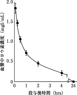 健康成人男子(4名)に本剤(370mgI/mL)40mLを静注すると、血漿中のヨウ素濃度は静注後5分で約1.9mgI/mL、30分で約1mgI/mLを示し、4時間後には0.2mgI/mL以下に減少した1)。