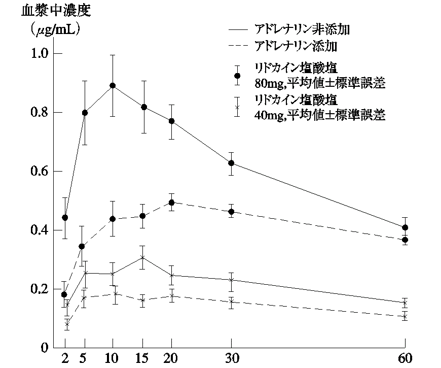 健康人に2%リドカイン液2mL又は4mL(リドカイン塩酸塩40mg又は80mg)を単独あるいはアドレナリンを添加(1:80,000)して下顎孔伝達麻酔・頬側浸潤麻酔に用いたとき、アドレナリン添加時の血漿中濃度は、単独投与時に比べ最高濃度の有意な低下、最高濃度到達時間の有意な延長が認められた1) 。