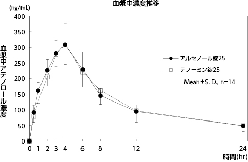 アルセノール錠25とテノーミン錠25を、クロスオーバー法によりそれぞれ2錠(アテノロール50mg)健康成人男子に絶食単回経口投与して血漿中未変化体濃度を測定し、得られた薬物動態パラメータ(AUC、Cmax)について統計解析を行った結果、両剤の生物学的同等性が確認された1)。