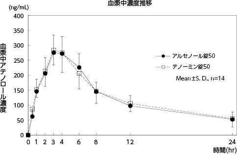 アルセノール錠50とテノーミン錠50を、クロスオーバー法によりそれぞれ1錠(アテノロール50mg)健康成人男子に絶食単回経口投与して血漿中未変化体濃度を測定し、得られた薬物動態パラメータ(AUC、Cmax)について統計解析を行った結果、両剤の生物学的同等性が確認された1)。