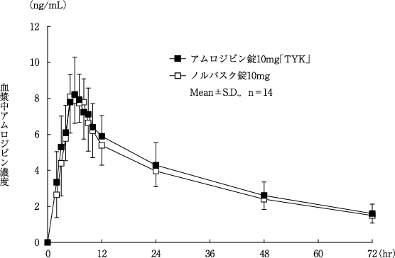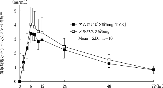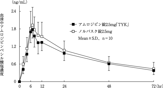 アムロジピン錠2.5mg「TYK」とノルバスク錠2.5mgをクロスオーバー法によりそれぞれ1錠(アムロジピンとして2.5mg)健康成人男子に絶食単回経口投与して血清中未変化体濃度を測定し、得られた薬物動態パラメーター(AUC、Cmax)について統計解析を行った結果、両剤の生物学的同等性が確認された8)。