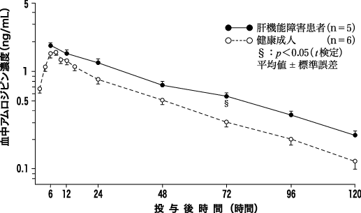 成人肝硬変患者(Child 分類A、Bクラス)5例にアムロジピンとして2.5mgを単回経口投与した場合の血中濃度推移並びに薬物動態パラメータは図及び表のとおりである。健康成人に比し、投与72時間後の血中濃度が有意に上昇し、T1/2、AUCはやや高値を示したが有意差は認められなかった14)。