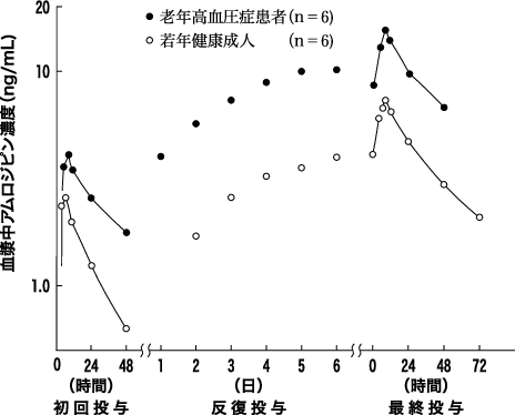 老年高血圧症患者6例(男2、女4、平均年齢79.7歳)にアムロジピンとして5mgを単回、及び8日間反復投与した場合の薬物動態パラメータは図及び表の通りである。単回投与した場合、若年健康成人(男6、平均年齢22.3歳)に比し、Cmax、AUCは有意に高値を示したが、T1/2に有意差は認められなかった。反復投与時には老年者の血清中アムロジピン濃度は若年者よりも高く推移したが、そのパターンは若年者に類似しており、老年者でその蓄積が増大する傾向は認められなかった4)。