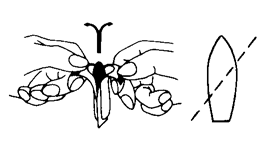 本剤を取り出すには、まず1個分の容器を切り離し、図のように上端の合わせ目から引裂いて、坐剤を取り出す。なお、1/2個を用いる場合には、図のように坐剤を斜めに切断する。