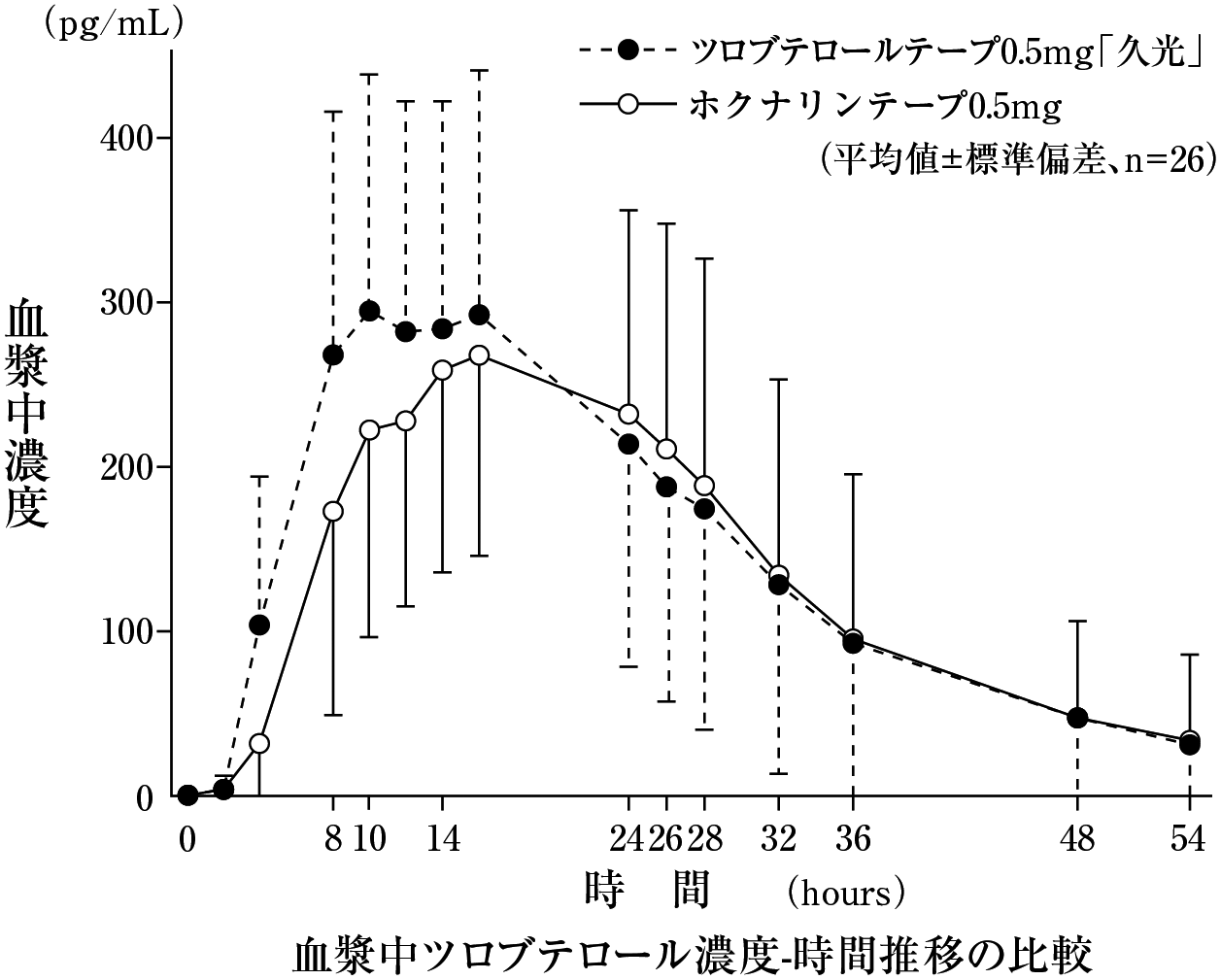 本剤(ツロブテロールとして0.5mg、1mgおよび2mgを含有)と対応するホクナリンテープを、健康成人男性に24時間、胸部に1枚を単回経皮投与した際の血漿中薬物濃度を測定した(2群2期クロスオーバー法)。これら薬物動態パラメータについて統計解析を行った結果、生物学的同等性が確認された3) 。