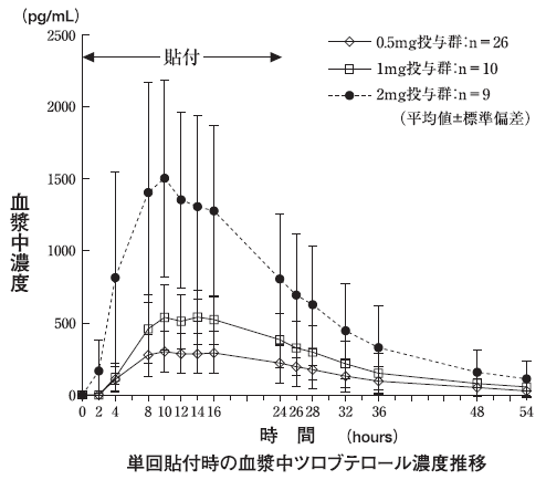 本剤(ツロブテロールとして0.5mg、1mgおよび2mgを含有)を、健康成人男性に24時間、胸部に1枚を単回経皮投与した際の血漿中薬物濃度の推移は以下のとおりであった。貼付後2時間で血中にツロブテロールが認められ、24時間後でも血漿中濃度の持続が認められた3) 。
