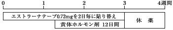 ○本剤0.72mgを2日毎に貼り替え休薬期間を入れずに連続貼付し、4週間の前半12日間に黄体ホルモン剤を併用。黄体ホルモン剤は原則として酢酸メドロキシプロゲステロン(MPA)5mg/日を投与。
