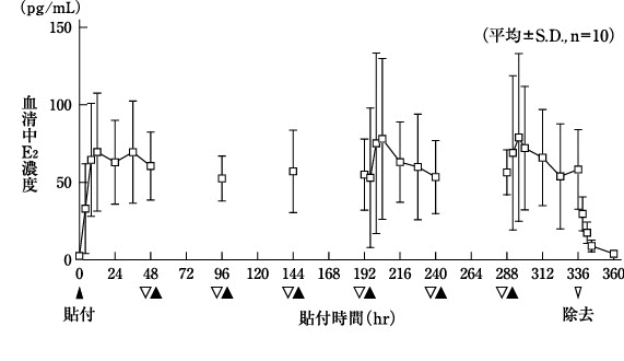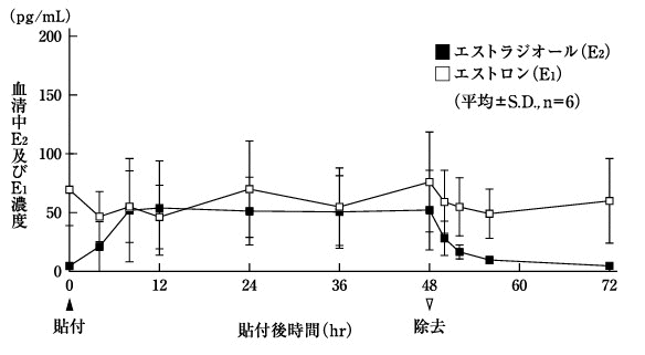 閉経後の健康女性に本剤0.72mg1枚を48時間単回貼付したとき、血清中エストラジオール(E2)濃度は貼付後緩やかに上昇し、貼付後8~12時間後から除去時までほぼ一定のE2濃度(52.0~53.8pg/mL)を維持し、除去後は速やかに減少した。血清中エストロン(E1)濃度については、貼付前から内因性のE1濃度が検出され、本剤0.72mgの貼付による明らかな濃度の上昇は認められなかった。また、除去後のE2消失半減期は約2時間であった22) 。