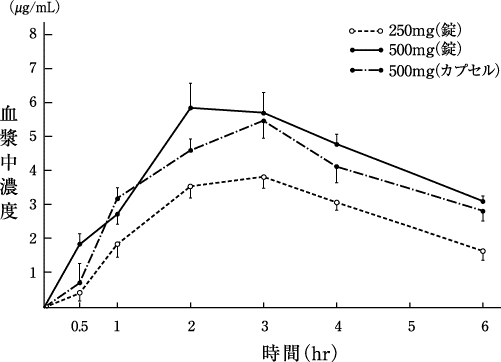 健康成人男性15例にトラネキサム酸(錠注)、カプセル注))を単回経口投与したとき、血漿中濃度推移及び薬物動態パラメータは次のとおりであった1)。