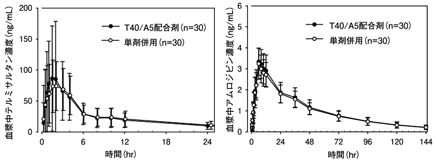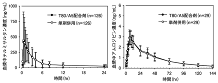 副作用発現割合はT80/A5mg配合剤で0.9%(1/112例)、T40/A5mg配合剤で1.8%(2/113例)であった。T80/A5mg配合剤投与群の副作用は低血圧0.9%(1/112例)で、T40/A5mg配合剤投与群の副作用は浮動性めまい0.9%(1/113例)、咳嗽0.9%(1/113例)であった。