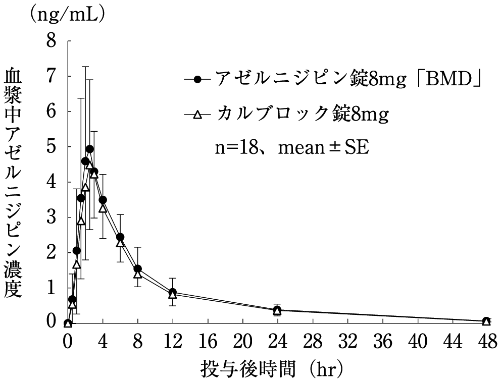 健康な成人男性6例にアゼルニジピン8mgを1日1回7日間連続経口投与したところ、最高血漿中濃度に到達する時間は2~3時間であり、半減期は19~23時間であった。投与後24時間の血漿中濃度は、投与2日目からほぼ一定の値を示し、速やかに定常状態に達した1) 。