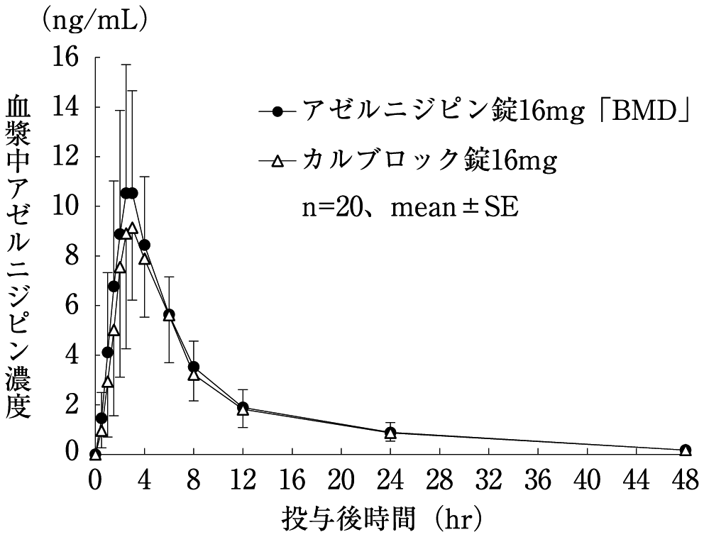 なお、アゼルニジピン8mgとアトルバスタチン10mg又はプラバスタチン10mgの併用投与では、血漿中アゼルニジピン濃度にほとんど変化はなく、血漿中アトルバスタチン濃度はCmax及びAUC0-∞がそれぞれ1.0倍、0.8倍、血漿中プラバスタチン濃度は同じく0.9倍、1.0倍であった16) 。