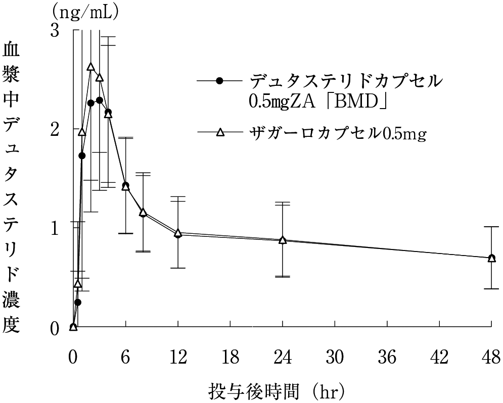 デュタステリドカプセル0.5mgZA「BMD」とザガーロカプセル0.5mgを、クロスオーバー法によりそれぞれ1カプセル(デュタステリドとして0.5mg)を健康成人男性に絶食単回経口投与して血漿中未変化体濃度を測定し、得られた薬物動態パラメータ(AUC、Cmax)について90%信頼区間法にて統計解析を行った結果、log(0.80)〜log(1.25)の範囲内であり、両剤の生物学的同等性が確認された(表2及び図1)8) 。