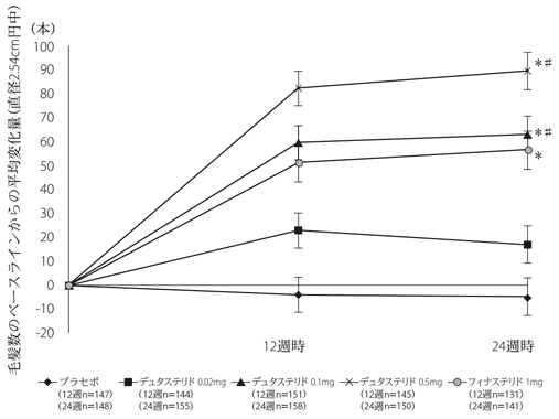 20歳から50歳の男性の男性型脱毛症患者(Norwood-Hamilton分類22) のⅢv、Ⅳ又はⅤ)917例(日本人200例を含む)を対象とし、デュタステリド(0.02注)、0.1及び0.5mg)を24週間投与した際のプラセボ及びフィナステリド1mgに対する有効性及び安全性を検討した。その結果、頭頂部円内(直径2.54cm円中)の毛髪数のベースラインからの変化において、デュタステリド0.1及び0.5mgのプラセボに対する優越性及びフィナステリド1mgに対する非劣性が検証された(表3及び図2)23),24) 。