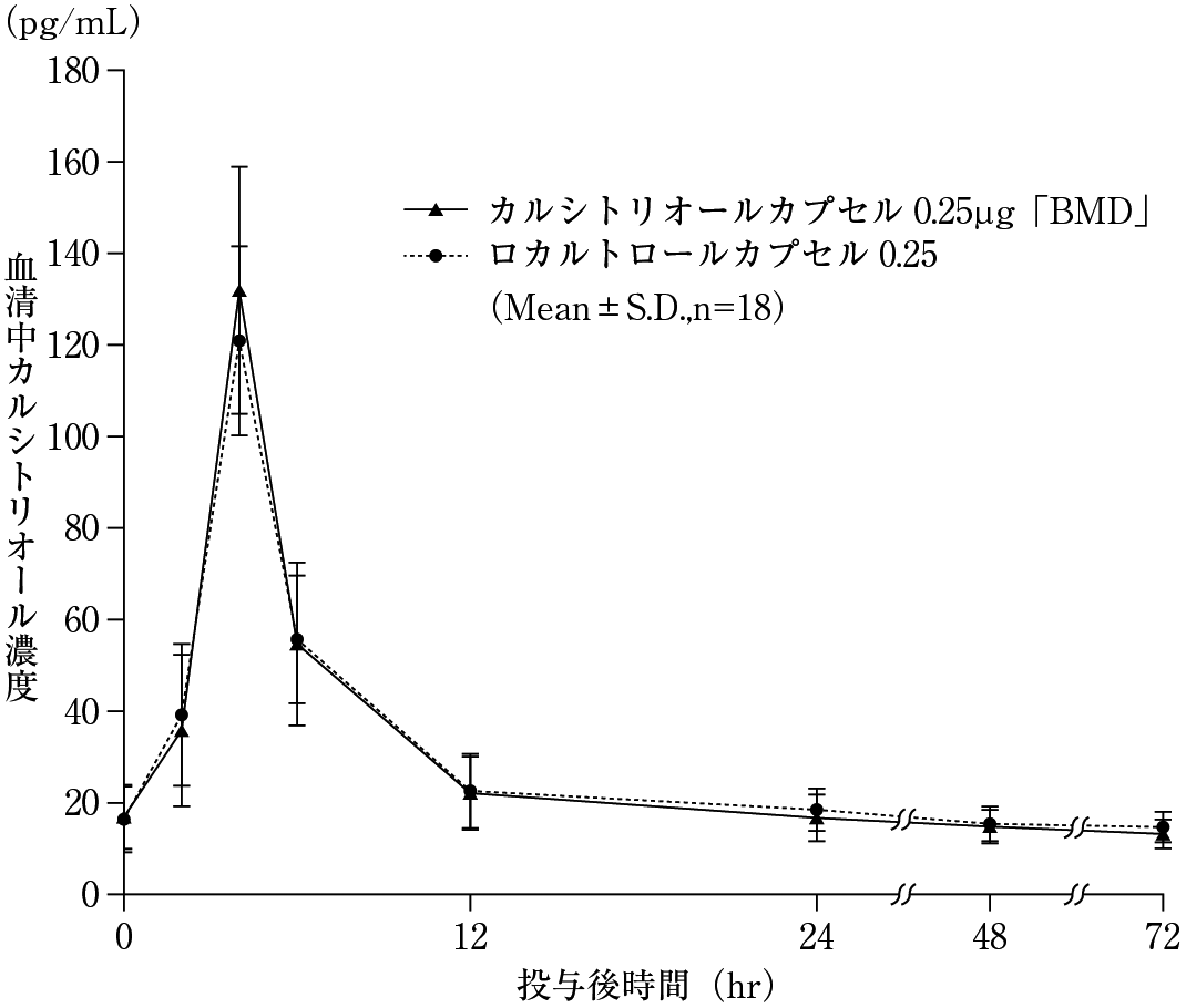 カルシトリオールカプセル0.25μg「BMD」とロカルトロールカプセル0.25をクロスオーバー法によりそれぞれ16カプセル(カルシトリオールとして4.0μg注2) )を健康成人男子18名に絶食単回経口投与して血清中未変化体濃度を測定し、得られた薬物動態パラメータ(AUC、Cmax)について90%信頼区間法にて統計解析を行った結果、log(0.8)~log(1.25)の範囲内であり、両剤の生物学的同等性が確認された4) 。