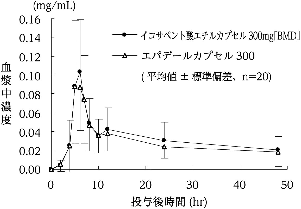イコサペント酸エチルカプセル300mg「BMD」とエパデールカプセル300をクロスオーバー法によりそれぞれ6カプセル(イコサペント酸エチルとして1,800mg)注3) 、健康成人男子20名に食直後に単回経口投与して、投与前の値を差し引いた血漿中のイコサペント酸濃度を測定した。得られた薬物動態パラメータ(AUC、Cmax)について90%信頼区間法にて統計解析を行った結果、log(0.80)~log(1.25)の両剤の生物学的同等性が確認された5) 。