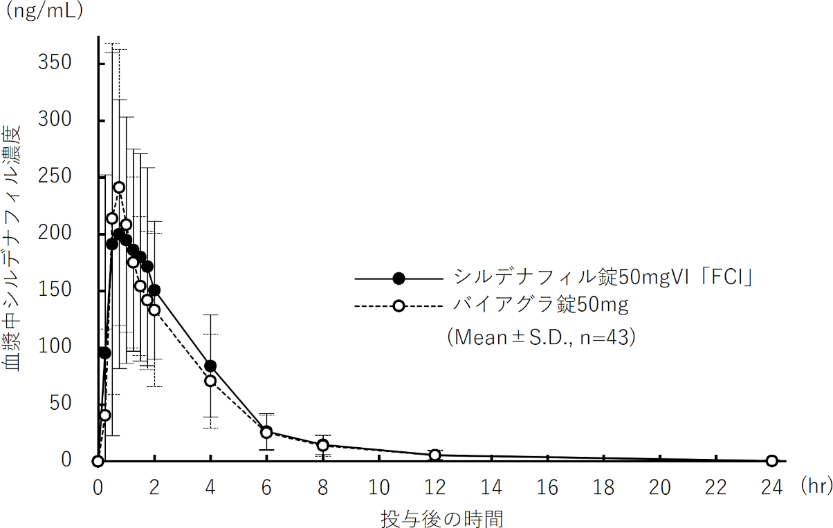シルデナフィル錠50mgVI「FCI」とバイアグラ錠50mgを、クロスオーバー法によりそれぞれ1錠(シルデナフィルとして50mg)を健康成人男子に絶食単回経口投与して血漿中シルデナフィル濃度を測定し、得られた薬物動態パラメータ(AUC、Cmax)について90%信頼区間法にて統計解析を行った結果、log(0.8)~log(1.25)の範囲内であり、両剤の生物学的同等性が確認された11) 。