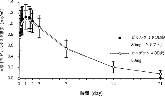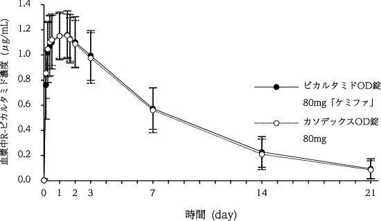 ビカルタミドOD錠80mg「ケミファ」又はカソデックスOD錠80mgをクロスオーバー法により、それぞれ1錠(ビカルタミドとして80mg)を健康成人男子に絶食単回経口投与(水ありで服用(n=23)及び水なしで服用(n=22))して活性体であるR-ビカルタミドの血漿中濃度を測定し、得られた薬物動態パラメータ(AUC、Cmax)について90%信頼区間法にて統計解析を行った結果、log(0.80)~log(1.25)の範囲内であり、両剤の生物学的同等性が確認された4)。