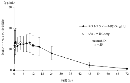 エストラジオール錠0.5mg「F」とジュリナ錠0.5mgをクロスオーバー法によりそれぞれ1錠(エストラジオールとして0.5mg)日本人閉経後健康女性に絶食単回経口投与して血漿中未変化体濃度を測定し、得られた薬物動態パラメータ(ΔAUC、ΔCmax)について90%信頼区間法にて統計解析を行った結果、log(0.80)~log(1.25)の範囲内であり、両剤の生物学的同等性が確認された22)。血漿中濃度並びにΔAUC、ΔCmax等のパラメータは、被験者の選択、体液の採取回数・時間等の試験条件によって異なる可能性がある。