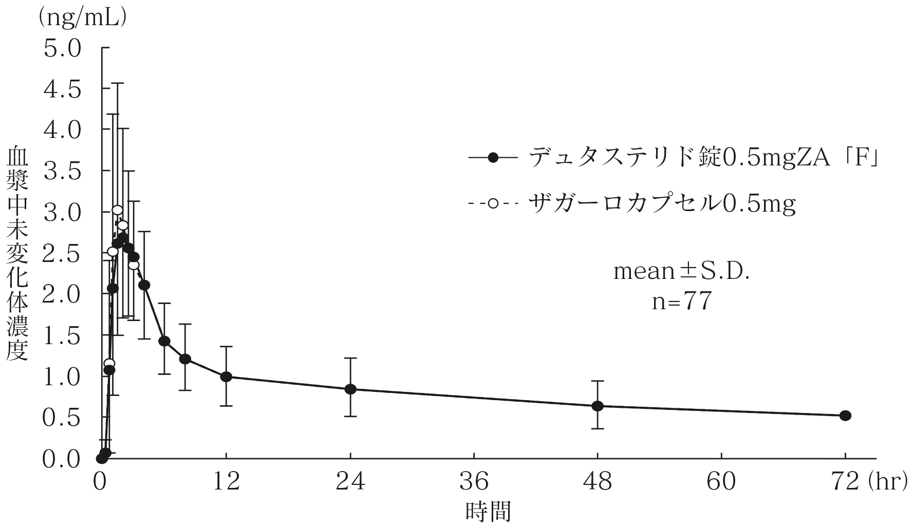 デュタステリド錠0.5mgZA「F」とザガーロカプセル0.5mgをクロスオーバー法により、それぞれ1錠又は1カプセル(デュタステリドとして0.5mg)を健康成人男子に絶食単回経口投与して血漿中未変化体濃度を測定し、得られた薬物動態パラメータ(AUC、Cmax)について90%信頼区間法にて統計解析を行った結果、log(0.80)~log(1.25)の範囲内であり、両剤の生物学的同等性が確認された8) 。