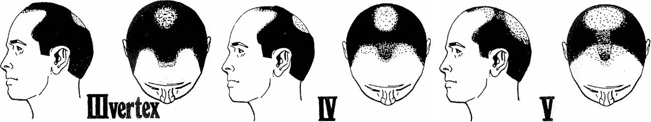 20歳から50歳の男性の男性型脱毛症患者(Norwood-Hamilton分類23) のⅢv、Ⅳ又はⅤ:図1)917例(日本人200例を含む)を対象とし、デュタステリド(0.02注6) 、0.1及び0.5mg)を24週間投与した際のプラセボ及びフィナステリド1mgに対する有効性及び安全性を検討した。その結果、頭頂部円内(直径2.54cm円中)の毛髪数のベースラインからの変化において、デュタステリド0.1及び0.5mgのプラセボに対する優越性及びフィナステリド1mgに対する非劣性が検証された(表1及び図2)24),25) 。