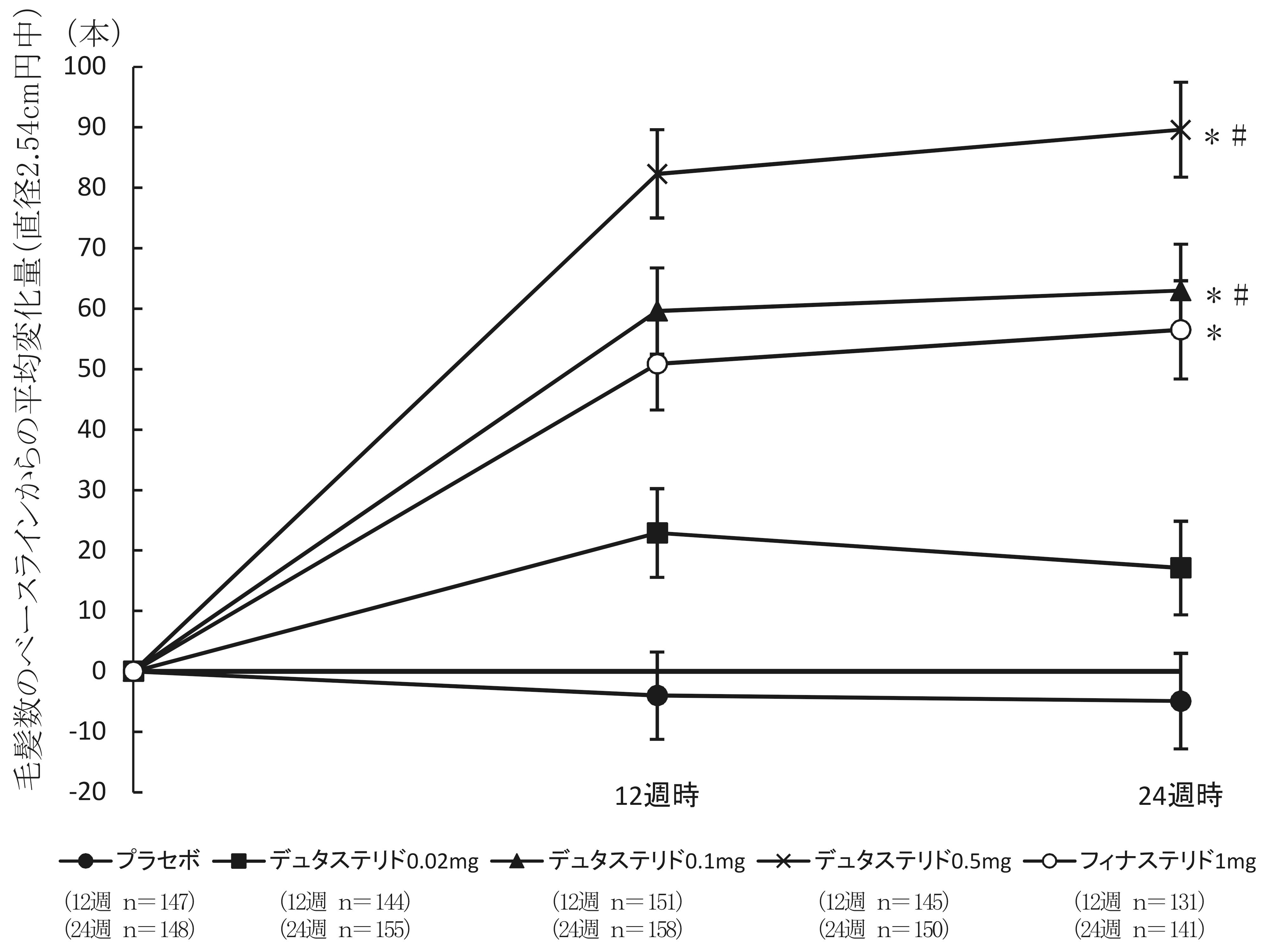 20歳から50歳の男性の男性型脱毛症患者(Norwood-Hamilton分類23) のⅢv、Ⅳ又はⅤ:図17-1)120例を対象とし、デュタステリド0.5mgを52週間投与した際の安全性及び有効性を検討した。その結果、52週時の頭頂部円内(直径2.54cm円中)の毛髪数のベースラインからの変化量は、68.1本であり改善が示された。