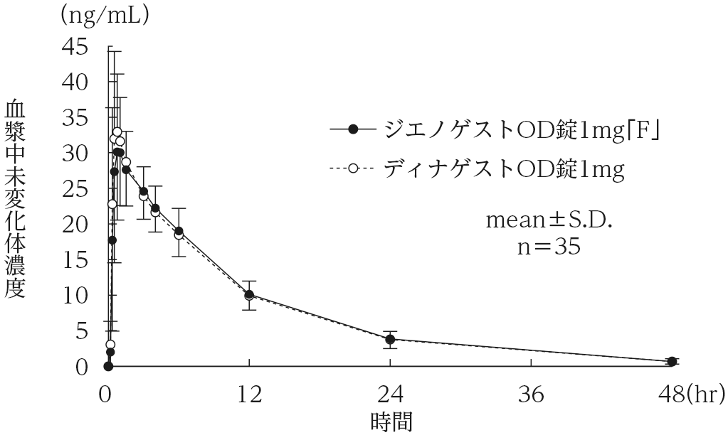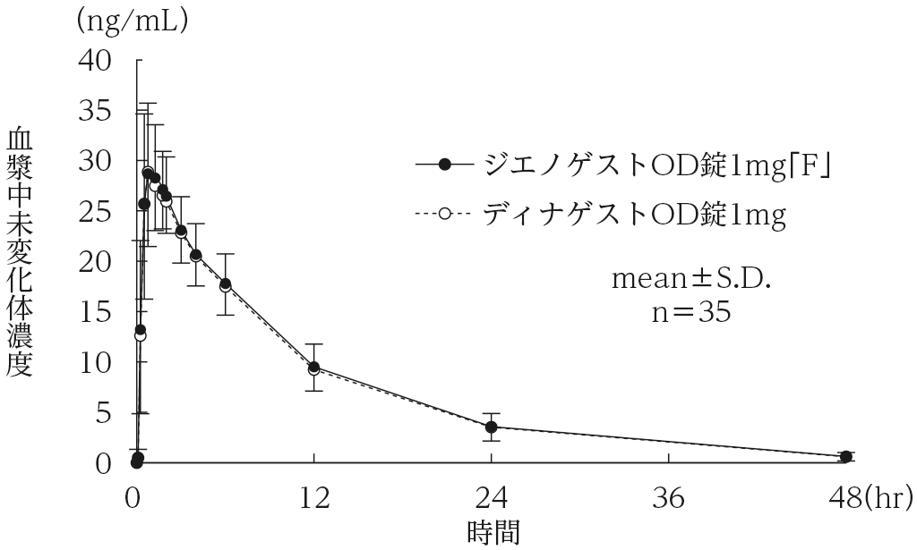 健康成人男性20例にジエノゲスト2mgを絶食単回経口投与(錠剤)及び静脈内投与注2) したとき、生物学的利用率は90.55%であった7) (外国人データ)。