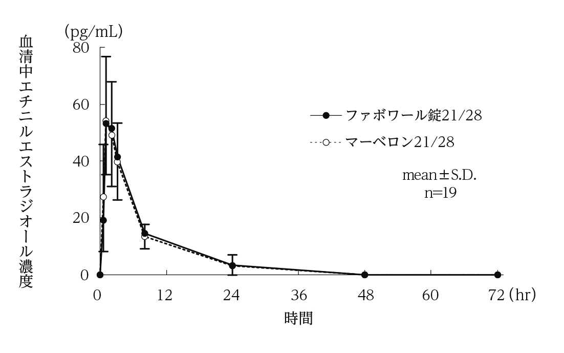 ファボワール錠21及びファボワール錠28とマーベロン21及びマーベロン28を、クロスオーバー法によりそれぞれ1錠(デソゲストレル0.15mg、エチニルエストラジオール0.03mg)健康成人女性に絶食単回経口投与し、血清中の3-ケト-デソゲストレル(デソゲストレルの活性代謝物)濃度及びエチニルエストラジオール未変化体濃度を測定し、得られた薬物動態パラメータ(AUC、Cmax)について統計解析を行った結果、両剤の生物学的同等性が確認された2) 。