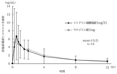 リトドリン塩酸塩錠5mg「F」とウテメリン錠5mgを、クロスオーバー法によりそれぞれ2錠(リトドリン塩酸塩として10mg)健康成人男子に絶食単回経口投与して血漿中未変化体濃度を測定し、得られた薬物動態パラメータ(AUC、Cmax)について統計解析を行った結果、両剤の生物学的同等性が確認された1)。注) 本剤の承認されている用法・用量は「通常、1回1錠(リトドリン塩酸塩として5mg)を1日3回食後経口投与する。なお、症状により適宜増減する。」である。