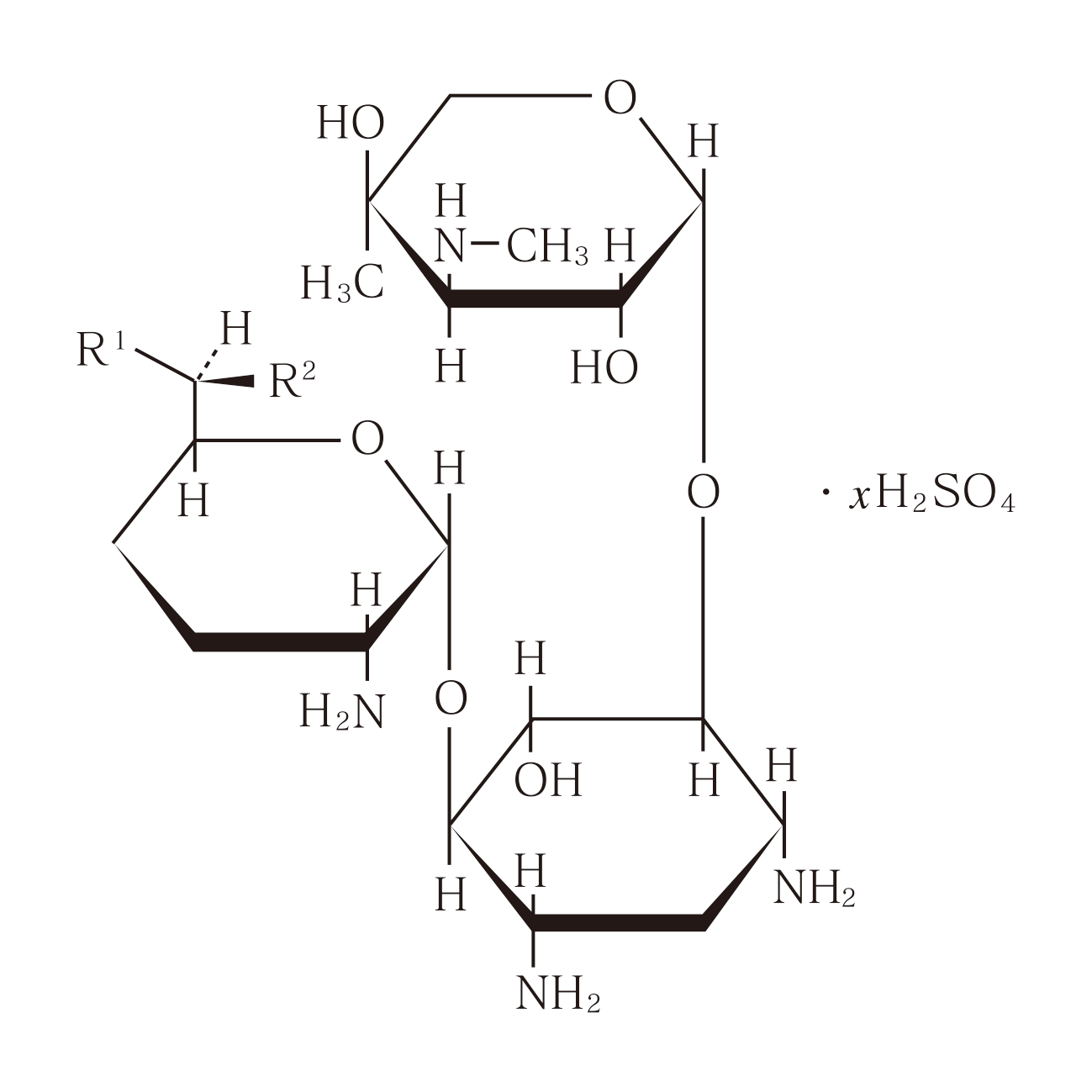 ゲンタマイシンC1硫酸塩:(6R)-2-Amino-2,3,4,6-tetradeoxy-6-methylamino-6-methyl-α-D-erythro-hexopyranosyl-(1→4)-[3-deoxy-4-C-methyl-3-methylamino-β-L-arabinopyranosyl-(1→6)]-2-deoxy-D-streptamine sulfateゲンタマイシンC2硫酸塩:(6R)-2,6-Diamino-2,3,4,6-tetradeoxy-6-methyl-α-D-erythro-hexopyranosyl-(1→4)-[3-deoxy-4-C-methyl-3-methylamino-β-L-arabinopyranosyl-(1→6)]-2-deoxy-D-streptamine sulfateゲンタマイシンC1a硫酸塩:2,6-Diamino-2,3,4,6-tetradeoxy-α-D-erythro-hexopyranosyl-(1→4)-[3-deoxy-4-C-methyl-3-methylamino-β-L-arabinopyranosyl-(1→6)]-2-deoxy-D-streptamine sulfate
