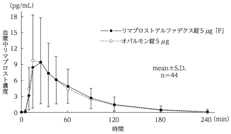 リマプロストアルファデクス錠5μg「F」とオパルモン錠5μgを、クロスオーバー法によりそれぞれ6錠(リマプロストとして30μg)健康成人男子に絶食単回経口投与して血漿中リマプロスト濃度を測定し、得られた薬物動態パラメータ(AUC、Cmax)について90%信頼区間法にて統計解析を行った結果、log(0.8)~log(1.25)の範囲内であり、両剤の生物学的同等性が確認された4)。(注)本試験における1回投与量は承認外の用量である。