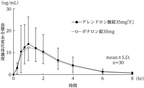 アレンドロン酸錠35mg「F」とボナロン錠35mgを、クロスオーバー法によりそれぞれ1錠(アレンドロン酸として35mg)健康成人男子に絶食単回経口投与して血漿中未変化体濃度を測定し、得られた薬物動態パラメータ(AUC、Cmax)について90%信頼区間法にて統計解析を行った結果、log(0.80)〜log(1.25)の範囲内であり、両剤の生物学的同等性が確認された3)。