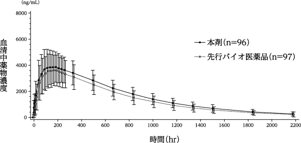 海外において、日本人を含む健康成人に本剤及び先行バイオ医薬品注1)をウステキヌマブ(遺伝子組換え)として45mgを単回皮下投与し、薬物動態(PK)を検討した。PK解析対象(本剤:96例、先行バイオ医薬品:97例)におけるPKパラメータ(Cmax、AUC0-t、AUC0-inf、Tmax及びt1/2)を表1に示す6)。このうちCmax及びAUC0-tの幾何最小二乗(LS)平均値比の90%信頼区間はいずれも生物学的同等性の基準範囲内(0.80~1.25)であった。