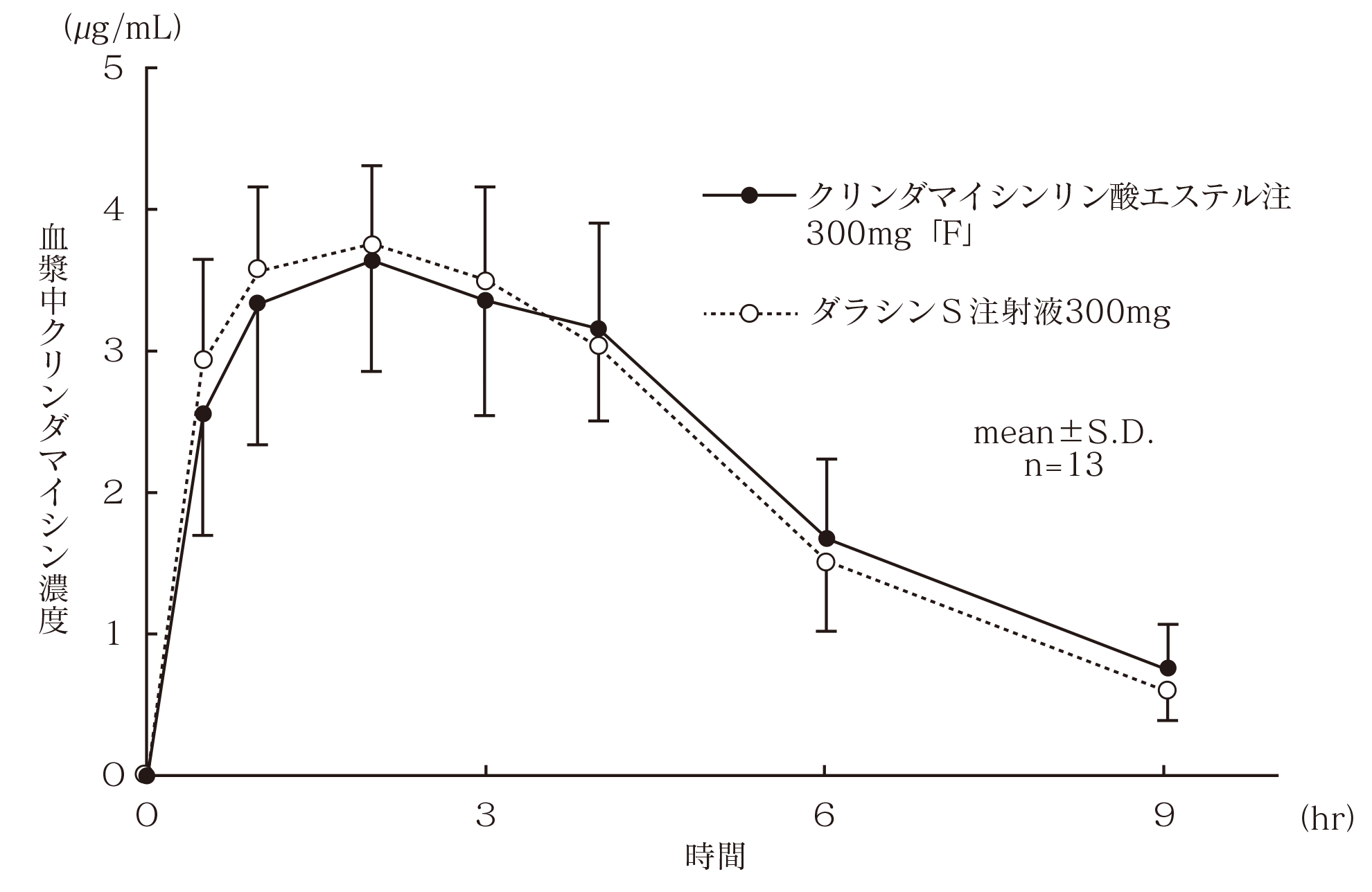 クリンダマイシンリン酸エステル注300mg「F」とダラシンS注射液300mgを、クロスオーバー法によりそれぞれ2mL(クリンダマイシンリン酸エステルとして300mg(力価))健康成人男子に筋肉内投与して血漿中クリンダマイシン濃度を測定し、得られた薬物動態パラメータ(AUC、Cmax)について統計解析を行った結果、両剤の生物学的同等性が確認された5)。