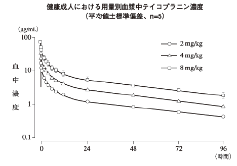 健康成人男子各群5例に2、4及び8mg/kgのテイコプラニンを30分かけて点滴静注したときの最高血漿中濃度はそれぞれ17.0、34.4及び71.8μg/mLを示し、投与後初期に比較的速やかに減少した後、終末半減期46~56時間ときわめて穏やかに消失した1)。