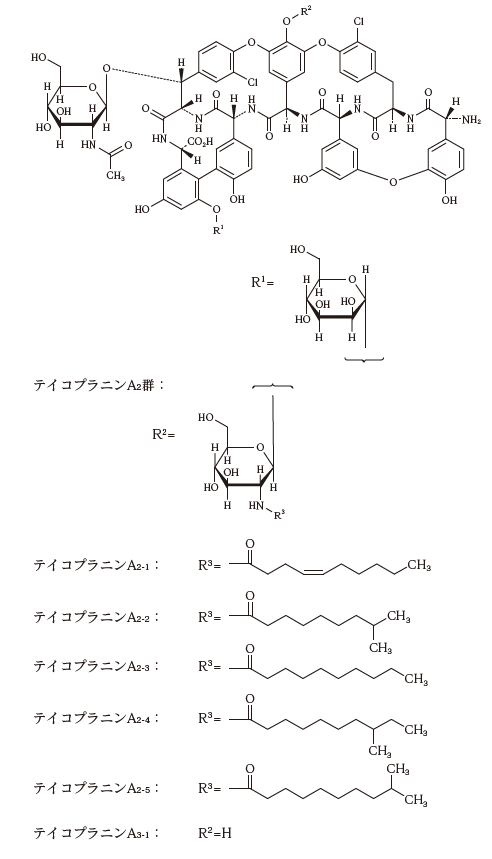 テイコプラニンA2-1、テイコプラニンA2-2テイコプラニンA2-3、テイコプラニンA2-4テイコプラニンA2-5及びテイコプラニンA3-1等の混合物