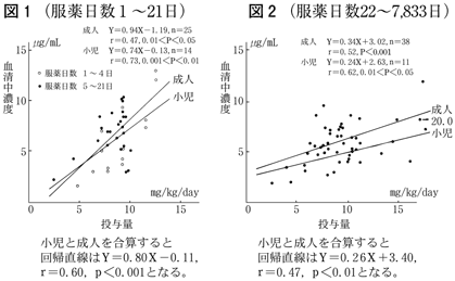 カルバマゼピンの単独投与を受けているてんかん患者の血清中濃度と投与量の関係は次図のとおりで、個人差は大きいが、投与初期は投与量に比して高い血清中濃度が得られ(図1)、その後は低くなる(図2)ことが示されている。単回投与後の未変化体の血中半減期は約36時間である。血清中濃度/投与量の比は投与開始10日までは上昇するが、その後低下し、血清中濃度は服薬日数に依存して変動することが認められるが、これは薬物代謝酵素の自己誘導によると考えられている。また、小児(6~13歳)と成人(14~64歳)の比較では、小児においてカルバマゼピン代謝速度が速いため低い値を示すものと考えられる7)。