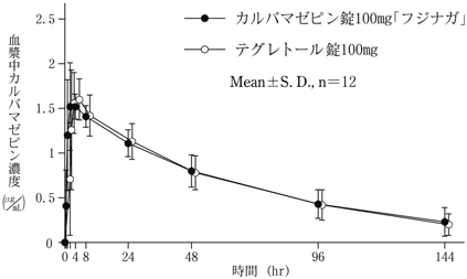 健康成人男性12例にカルバマゼピン錠100mg「フジナガ」1錠とテグレトール錠100mg 1錠(カルバマゼピンとして100mg)を2剤2期のクロスオーバー法により絶食単回経口投与して血漿中濃度を測定し、得られた薬物動態パラメータについて統計解析を行った結果、両剤の生物学的同等性が確認された8)。